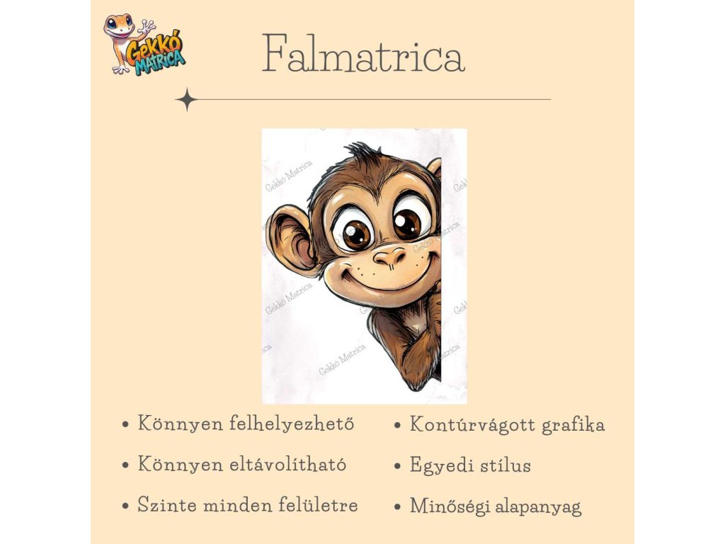 Vidám kukucskáló majom ajtómatrica, amely játékosságot visz a gyerekszoba bejáratához, és más matricákkal is kombinálható.