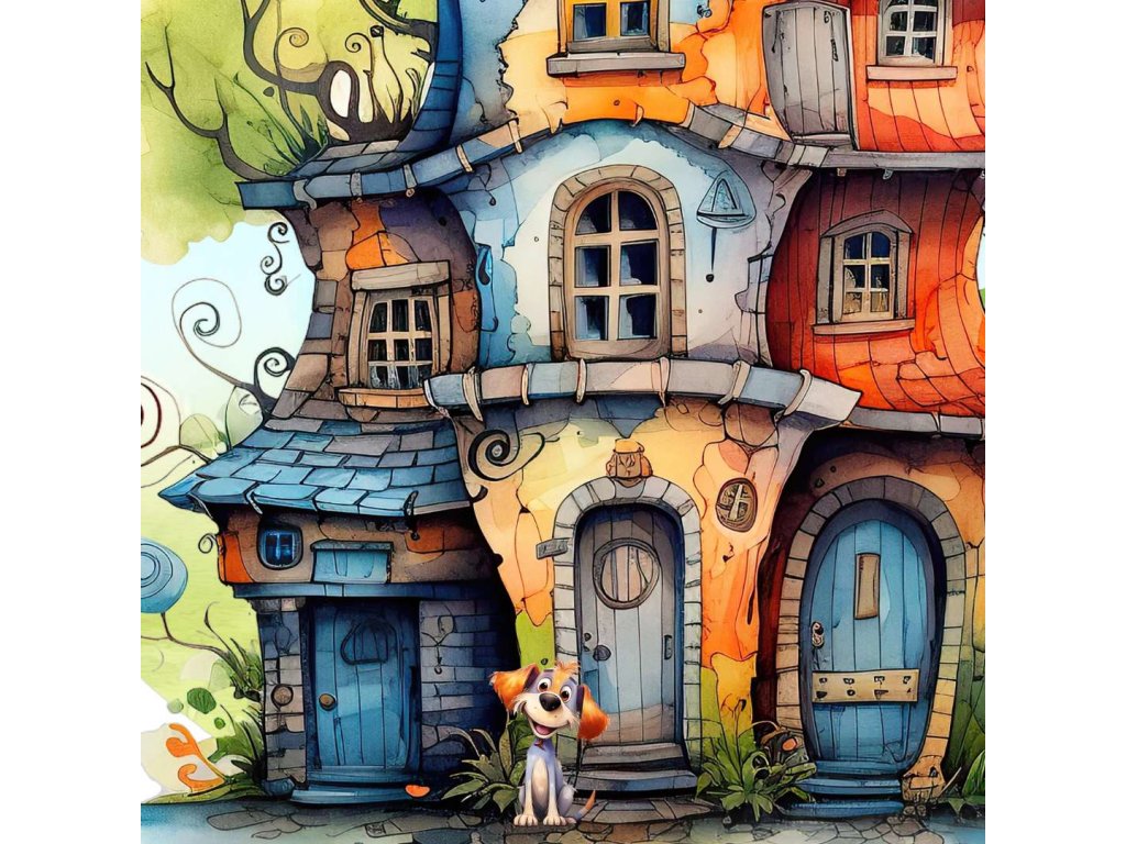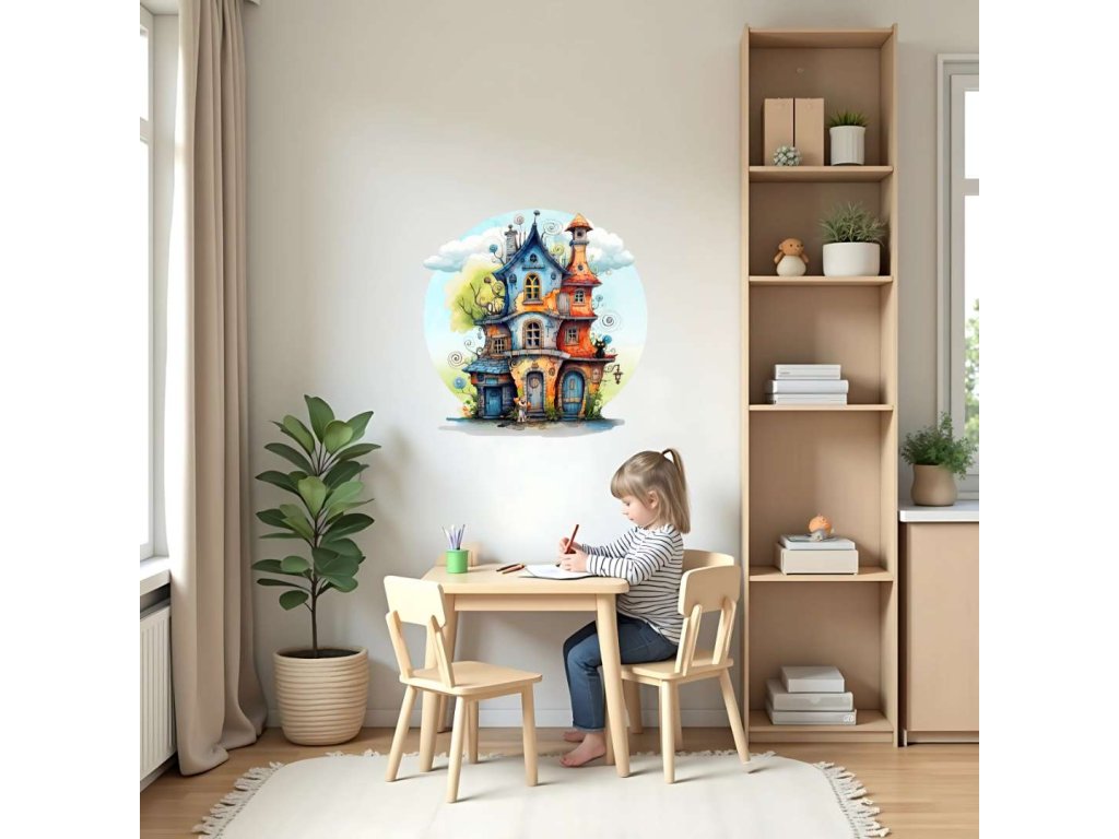 Ez a különleges falmatrica egy mesebeli, kétszintes házikót ábrázol, amely vidámságot és játékosságot hoz bármelyik helyiségbe. A színes, részletgazdag grafika tökéletesen illik gyerekszobába, de a nappali falán is egyedi dekoráció lehet.